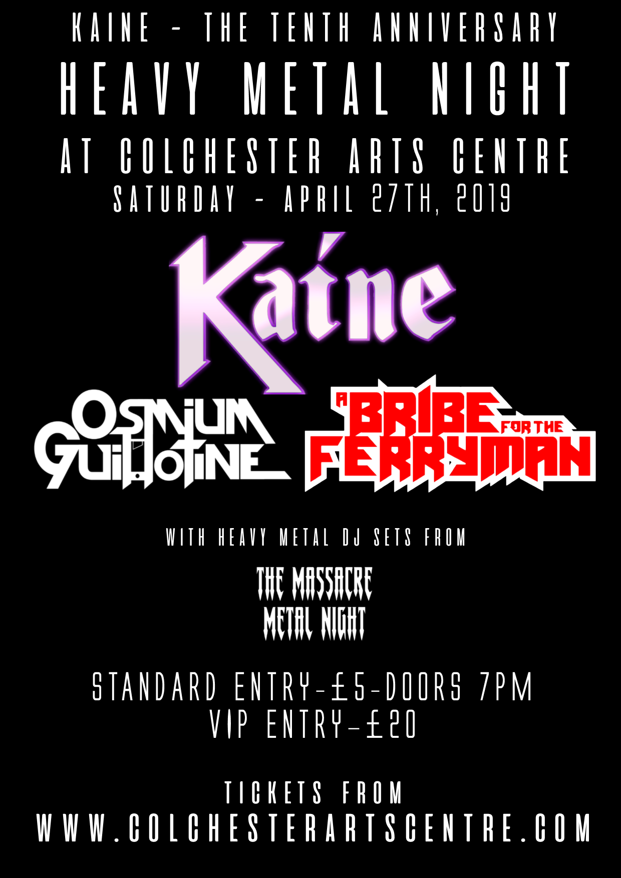 The band will be joined by A Bribe for the Ferryman, which features Kaine founding member Josh Moreton on drums, Osmium Guillotine who Kaine have played many shows alongside over the past decade to celebrate the event. There will also be Heavy Metal DJ sets throughout the night from The Massacre Metal Night.