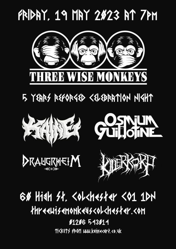 Kaine will be celebrating 5 years of the Reforged line-up with a special gig, and live album recording at Three Wise Monkeys, Colchester on Friday, May 19th, 2023. Joining them will be guests Osmium Guillotine, Killerkorp, and Heathen Kings.